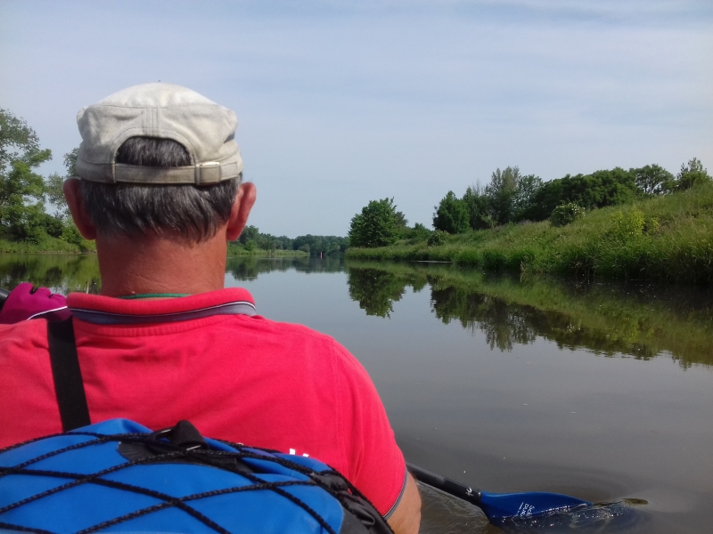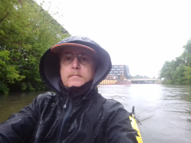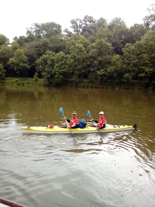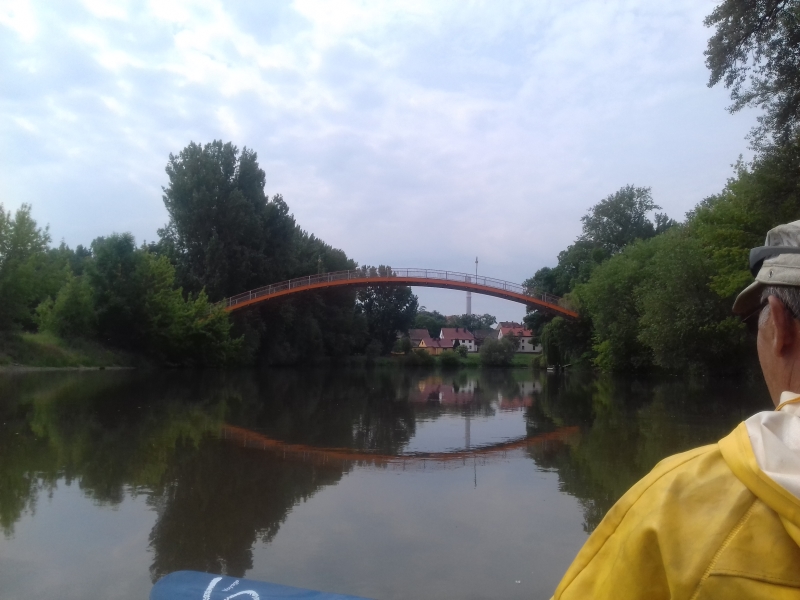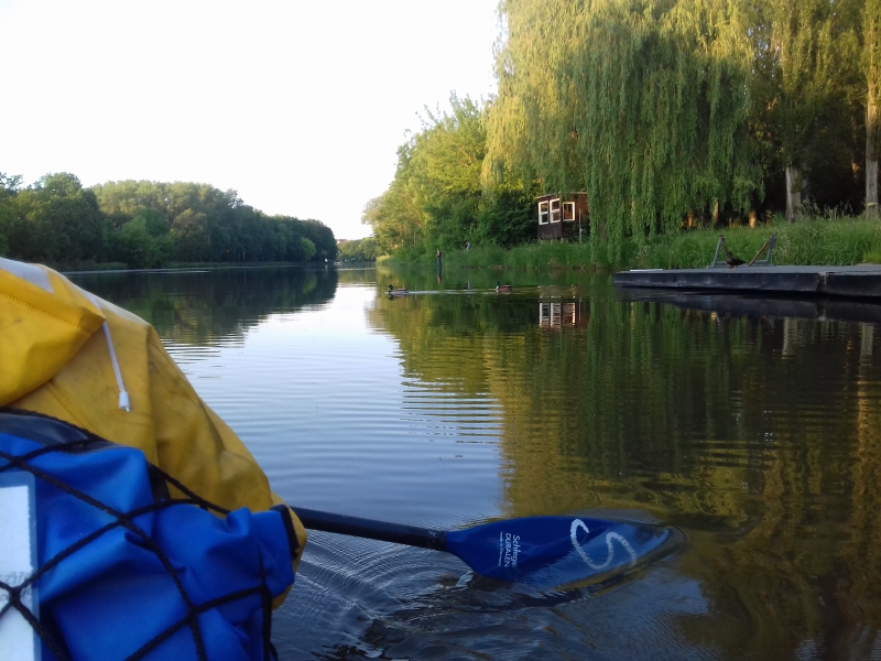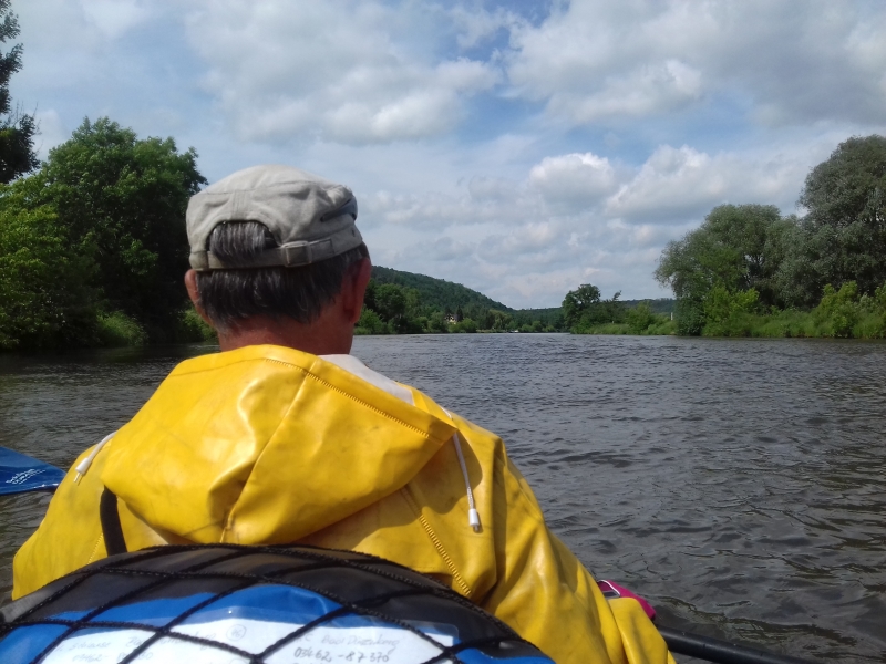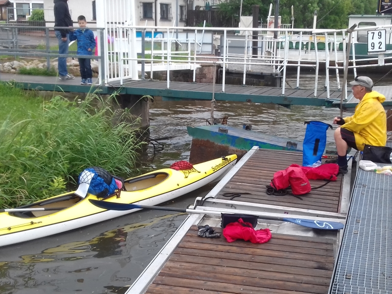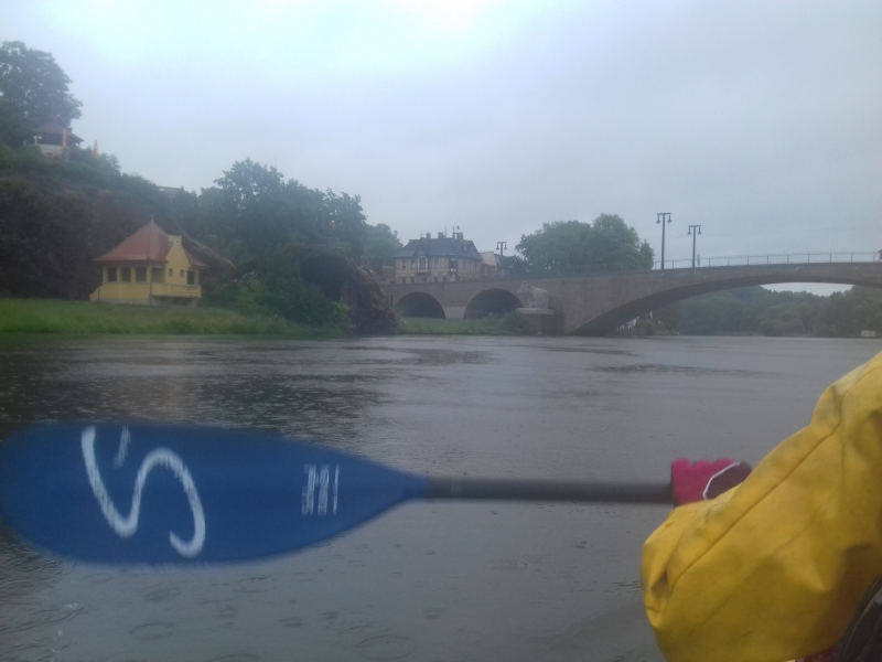 Gleich unterhalb des Bootshauses wartete schon das erste Hindernis, die Schleuse Bad Dürrenberg. Anrufe beim Schleusenmeister brachten kein Ergebnis und so war kurz nach dem Einstieg schon ein erster Ausstieg erforderlich. Glücklicherweise fanden wir den Schleusenwart hinterm Haus den Vorgarten verschönernd. Noch während der ersten Schleusung setzte Regen ein und die Regenjacken wurden eilig aus den Packsäcken hervorgeholt. Dieser hielt zwar nicht lange an, gab uns jedoch einen Vorgeschmack auf das, was kommen sollte. An diesem Tag jedoch ließ sich Klärchen öfter sehen und wir genossen die Fahrt dem windungsreichen Flussverlauf folgend vorbei an Wäldern und Auen, zu stoppen nur durch die Schleusen Rischmühle, Merseburg-Meuschau und Planena. Unsere ständigen Begleiter waren nicht etwa Kanuten, wie wir, sondern Stockenten, Gänse, Graureiher und Schwalben, aber auch ein Eisvogel. Als wir nach knapp 30 km am Ruderhaus Böllberg, unserem heutigen Quartier, ankamen, setzte der Regen wieder ein. Nach einigem Suchen fanden wir eine Futterstelle bei McDöner und ließen es uns richtig schmecken.
