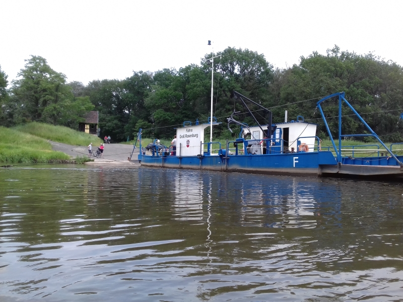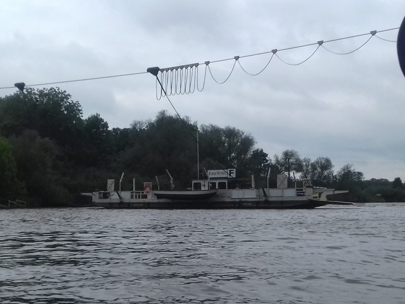 Nach 123 Saalekilometern erreichten wir schließlich die Elbe. Unser Endziel war jedoch Breitenhagen und so klotzten wir noch einmal ran und kämpften uns gegen die Strömung den buhnenlosen letzten Kilometer bis zur Fähre gen Heimat. Man wollte sich ja keine Blöße geben. Hier erwarteten uns bereits Elvina und Sohn mit dem Fahrzeug, welches uns nach Aken brachte. An dieser Stelle möchten wir uns herzlich bei ihr für die Transporte von Boot und Besatzung bedanken.