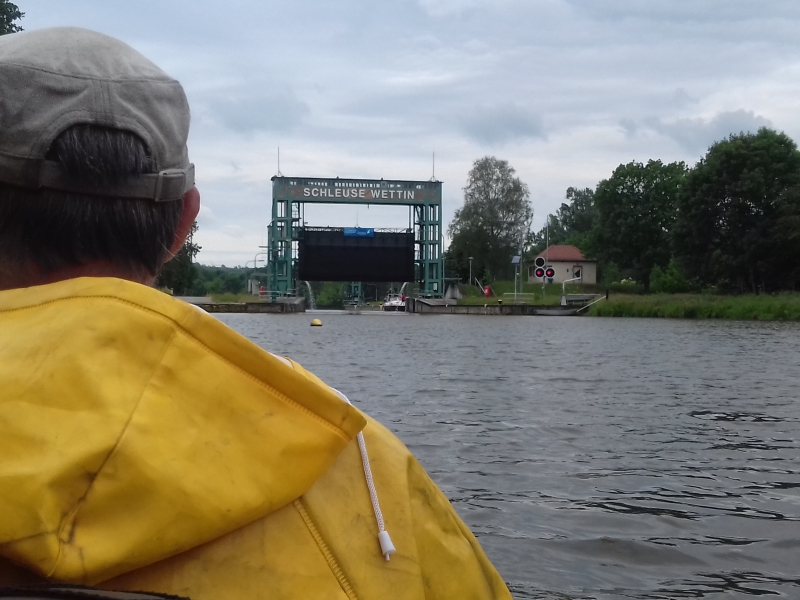 Ein ausgiebiges Frühstück mit Rührei und allem Drum und Dran sowie reichlich Kaffee war dazu geeignet, an diesem frühen Pfingstmorgen die Stimmung zu beleben, denn über der Saale hatte sich eine undurchdringliche graue Wolkenschicht festgesetzt und es regnete unaufhörlich. Zunächst jedoch hatten wir eine andere Widrigkeit zu überwinden. Die Schleuse Halle-Böllberg sollte erst um 9:30 Uhr öffnen und anderthalb Stunden zu warten, kam uns nicht in den Sinn. Kurzerhand bugsierten wir unser Schiff, vollbeladen, über die Böschung und schossen unterhalb des Wehrs die ausgewiesene Wildwasserstrecke entlang, bis wir die träge dahin fließende Hauptsaale wieder erreicht hatten. Nun folgten die Selbstbedienungsschleusen Halle und Gimritz sowie Trotha. Wir setzten unsere Reise beharrlich fort, Wasser von unten, von oben, links und rechts. Spritzdecken bewahrten uns vor dem Schlimmsten, konnten aber auf Dauer Pfützen in Rudi's Sitzschale nicht verhindern. Da Motorbootsportler und Schönwetter-Ausflügler bei diesem Wetter nicht auszumachen waren, zeigten sich uns einige scheue Uferbewohner: ein Reh auf dem Weg zur Tränke, ein Waschbär streckte interessiert den Kopf aus dem Gras, ein Schwaanenpaar verteidigte mit drohendem Zischen seine grauflauschigen Nachkommen und eine Bisamratte suchte eilig Schutz in der Böschung. Auch Kormorane und Möven waren zu beobachten. Stille allenthalben und nur unsere Paddel tauchten gleichmäßig in die Fluten. Der Antrieb lief kraftvoll und synchron wie ein gut geschmierter Zweitakter. Das Knarren der selbstgebauten Sitzlehne des Schlagmannes bestimmte gleich einem Metronom den Paddel-Rhythmus, bei dem man mit muss. Gegen Mittag erreichten wir die Fähre Wettin und der Himmel klarte auf. Erste Sonnenstrahlen auf dem Buckel taten dem Körper und der Seele gut. Ein improvisiertes zwei-Sterne-Menü am Motorbootsteg war eine willkommene Pause, bevor wir uns frisch gestärkt wieder der Natur, dem Paddeln und dem auffrischenden Gegenwind widmen konnten. Drei weitere Schleusen nehmend erreichten wir abgekämpft doch voller Eindrücke nach 58 Tageskilometern den Steg und das Gästehaus der Bernburger Wasserwanderer. Freundlich empfangen bezogen wir Quartier, vermieden es aber, die Doppelstockbetten in der zweiten Etage zu belegen. Am Kai der Motosportler gab es auch gleich eine Gaststätte, wo wir verlustige Kalorien wieder ersetzen wollten. Die kulinarische Einrichtung erwies sich als wahre Kuriosität. Das Personal war durchweg indisch, die Speisekarte durchweg italienisch, die Preise durchweg gepfeffert, der Kellner schlampig gekleidet, unverschämt und obendrein des Rechnens nur mäßig kundig. So idyllisch das Restaurant auch am Ufer der Saale gelegen, zu empfehlen ist es nicht. Trotz allem hatten uns zwei Kinderportionen satt gemacht und der Bedienung konnten auch noch ein Kaffee und ein Tee abgerungen werden. Ein Abendspaziergang zur Bernburger Schleuse entlang der beleuchteten Schlossanlage erbrachte zwar keinen Hinweis auf deren Öffnungszeiten, doch eine hilfsbereite Anwohnerin versicherte uns, dass eine zeitige Talschleusung möglich sei.