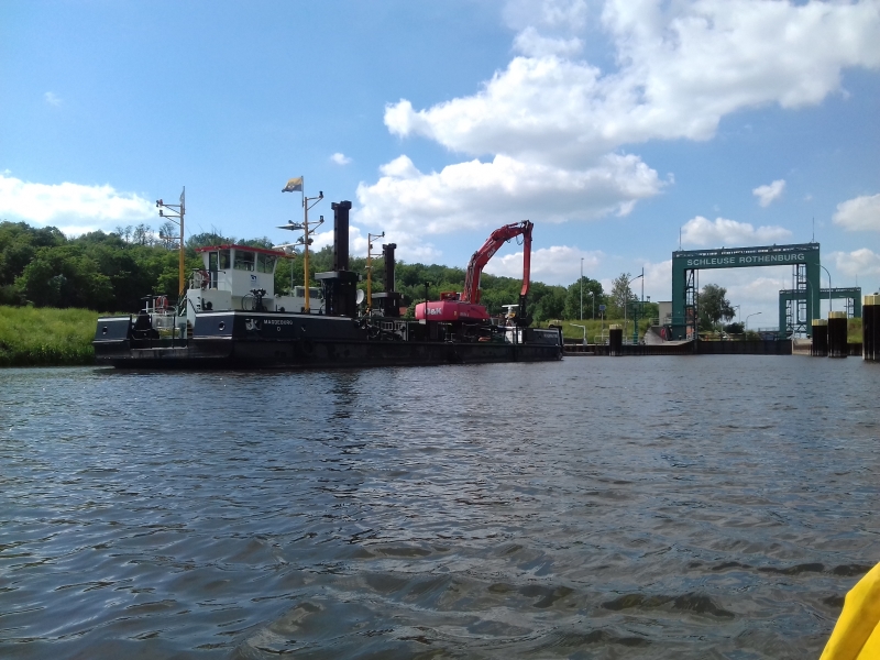 Der nächste Morgen bescherte uns Sonne satt. Die Bernburger Schleuse war nach 30 Minuten bereits Geschichte und so arbeiteten wir uns die friedvolle Ruhe genießend von Bernburg über Nienburg durch bekanntes Gelände nach Calbe vor. Erleichtert stellten wir fest, dass die Schleuse wieder in Betrieb ist und wir auf ein erneutes Umtragen verzichten konnten. Mit dieser letzten Hürde hatten wir auf unserer Fahrt dreizehn (13) Schleusen absolviert und beanspruchen daher den Titel „Schleusenbezwinger des Monats“. Auf den letzten Kilometern nimmt die Saale streckenweise noch einmal richtig Fahrt auf und erreicht bei Trabitz sogar Fließgeschwindigkeiten von 3-4 Kilometer pro Stunde, während sie im oberen Verlauf eher als stehendes Gewässer wahrgenommen wurde. Ein letztes Nachtanken von festem und flüssigem Treibstoff an der Fähre von Groß Rosenburg rüstete uns für den finalen Abschnitt. Zum Abschluß bekamen wir noch einen eher seltenen Bewohner im Saalerevier zu Gesicht. Zwischen den Ufersteinen sprang eine aufgeregte Minkmutter hin und her, ihr laut fiependes Junges in Sicherheit bringend. (Mink: auch "Amerikanischer Nerz" genannt aus der Familie der Marder.)